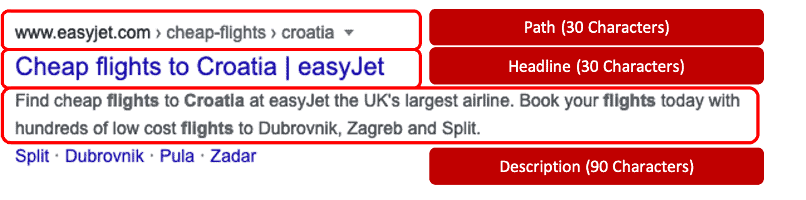 It consists of a headline, a display URL, and two lines of description. Each line of the ad has a limited character count; there’s an art to writing an eye-catching, compelling message that, ideally: