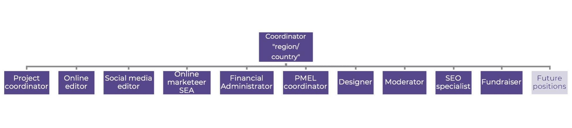 Here’s a draft of an organisational chart that RNW Media has created in 2020 to give an overview of the different functions based on experiences with regional partners. This minimum viable team can function as a guideline of what skills are needed in an organisation to successfully manage a digital community.