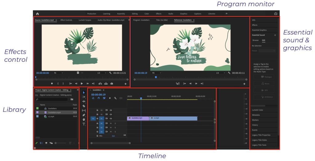 In all the different editing software programs there is the main working space, which is called the workspace. Here you will find different “panels’ which are block areas where you do different things. In Adobe Premiere Pro, the workspace is distributed automatically, you can arrange the blocks differently to make your work process easier but the standard setting works perfectly. If you are new to the program on your left most likely a “learning” panel will appear which will guide you through the basic aspects of the software. There are also different types of workspaces that you can choose depending on the thing you are focusing on in your video, for example, you will see at the top of the workspace a bar that says: Production, Learning, Assembly, Editing, Color, Effects, Audio, Graphics, Captions, and more. Each workspace’s layout will make it easier to work on each feature.