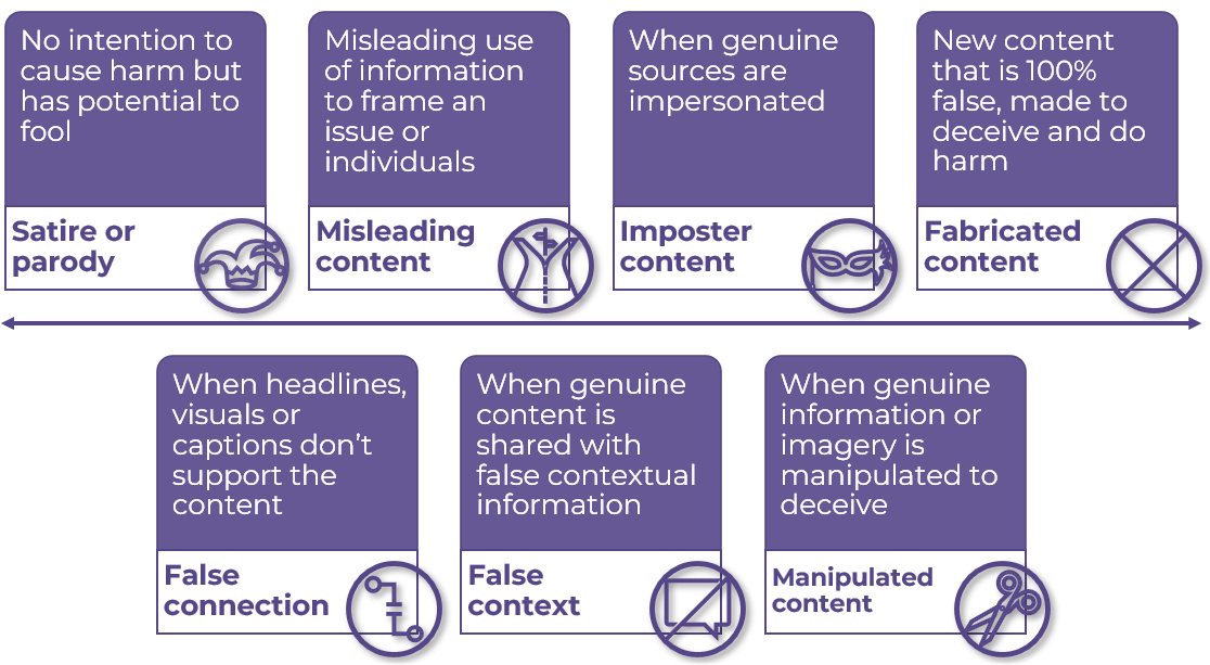 There are seven distinct types of problematic content that sit within our information ecosystem. They sit on a scale that loosely measures the intent to deceive.