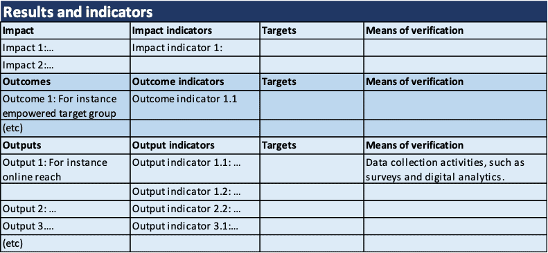 Data on your results and indicators can be collected in a matrix as depicted below.