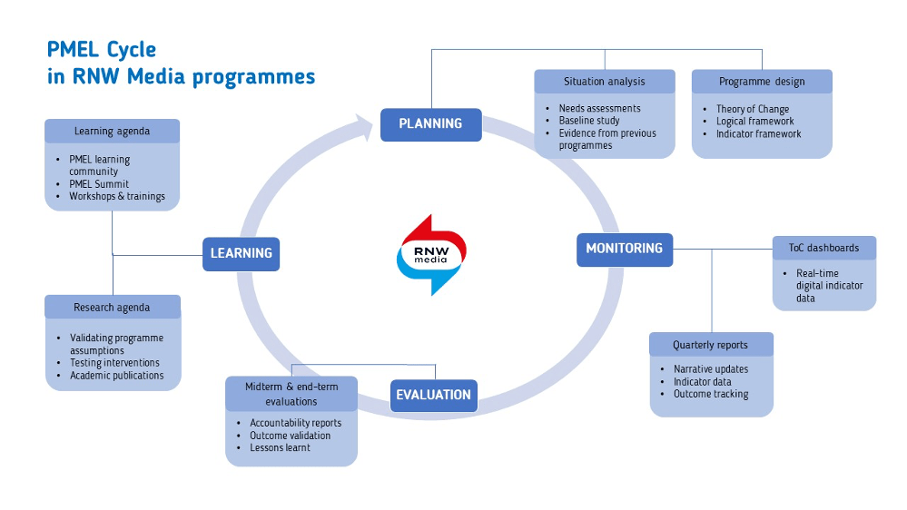 RNW Media’s PMEL consists of a mixed-method approach, combining quantitative and qualitative data collection, and analysis methods from both digital and non-digital sources. Data is collected on output level to be able to show how many people are reached globally, and how they engage with our platforms. Data is also collected on outcome level, to show the longer-term effects of our projects on the people we reach and the societies in which they live.
