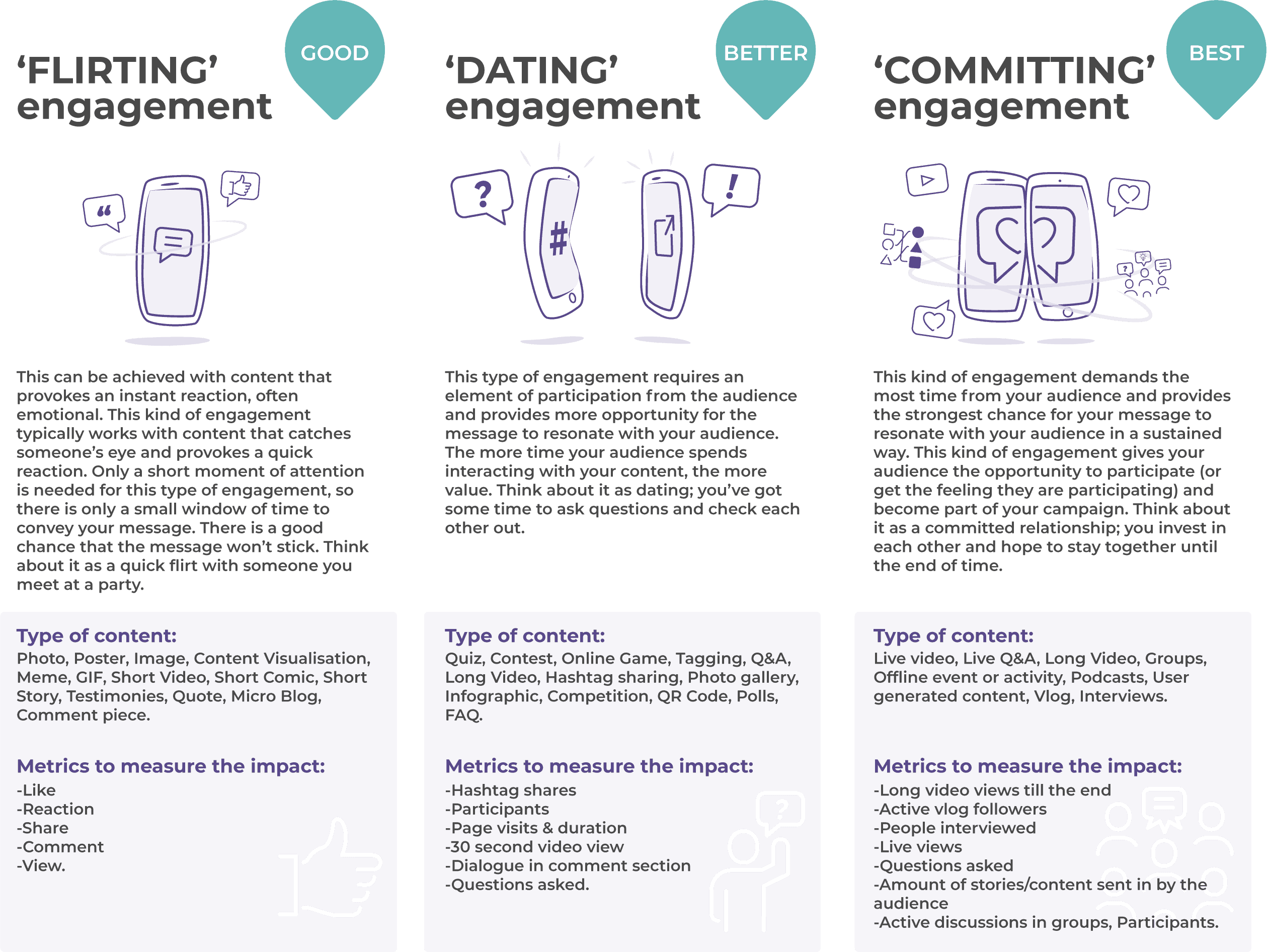 Different types of content will get a different type of engagement from your audience and will give you a different metric to measure. Some metrics are more valuable than others when it comes to assessing the success of your campaign. For example: a long discussion between people in the comment section gives you better insights than a simple like on a post. Or a 30-minute video that people watch till the end gives you a better chance to tell your story than a 3 second GIF. There are roughly 3 types of engagement: