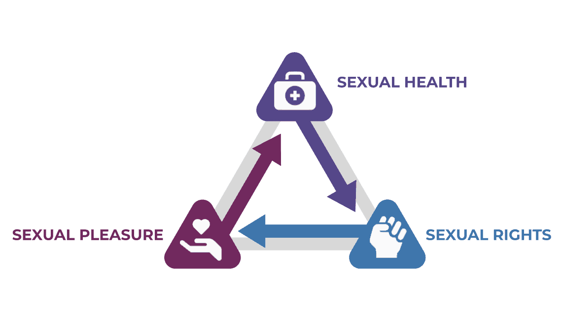 There are three interlinked elements to the triangle approach: sexual health, sexual rights, sexual pleasure. This refers to the “triangle approach”, a conceptual framework designed by the Global Advisory Board for Sexual Health and Wellbeing (GAB) to strengthen SRHR policy and programming. Addressing each of the elements is crucial to be able to ensure a positive approach to sexuality in SRHR interventions. For a shared understanding of these terms, it is important to define them.