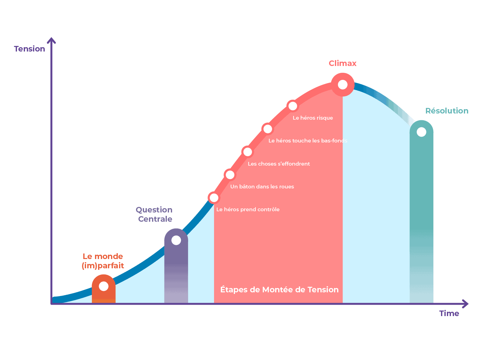 Nous allons examiner chacun de ces éléments en détail ci-dessous. Le graphique suivant montre « l’arc de suspense » et permet de visualiser ces 8 éléments essentiels.