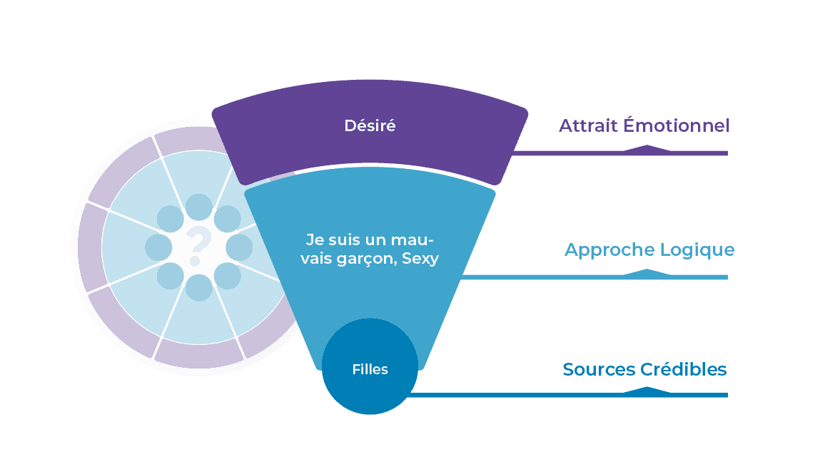 Par exemple : je veux cibler « certains adolescents qui croient que fumer est attirant pour les filles, qui se voient donc comme des mauvais garçons sexy, et qui se sentent donc désirés ».