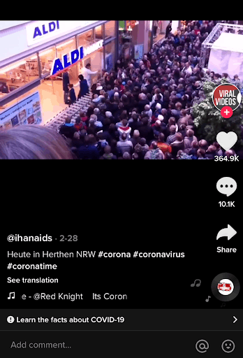 During Covid-19 there have been cases around the world of hoarding, whereby individuals are buying large and unnecessary amounts of produce from the supermarkets in order to stock up. Photos and videos began circulating that appeared to show this hoarding. This screenshot from a video on TikTok was viewed over 4 million times, and appears to show huge crowds outside a supermarket, with the caption implying it was due to corona. Bellingcat were able to prove the video was old, and not related to the current Covid-19 crisis, instead dating back to an Aldi sale in 2011.