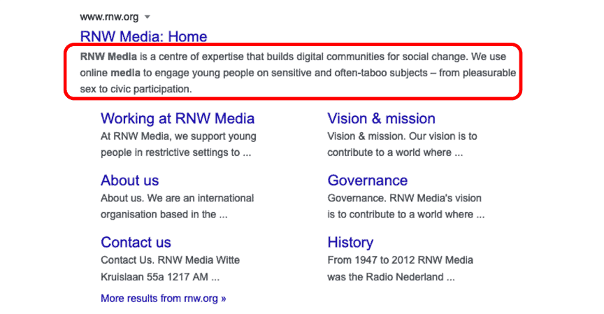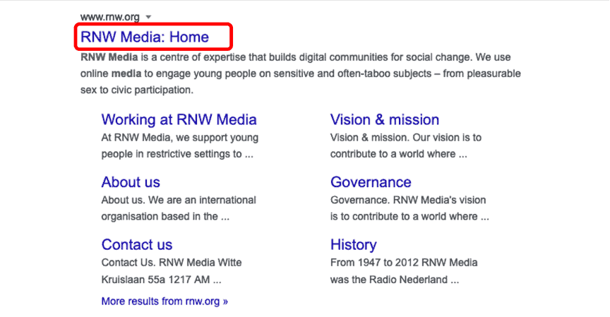 Description tags are what appear in the search engine results pages – they give the web user an overview of what the site is about. Put your marketer’s hat on and write a description that convinces users to click on the result. This is your site’s first opportunity to attract visitors, so it is vital that you give your organisation the best chance of standing out from the other results.